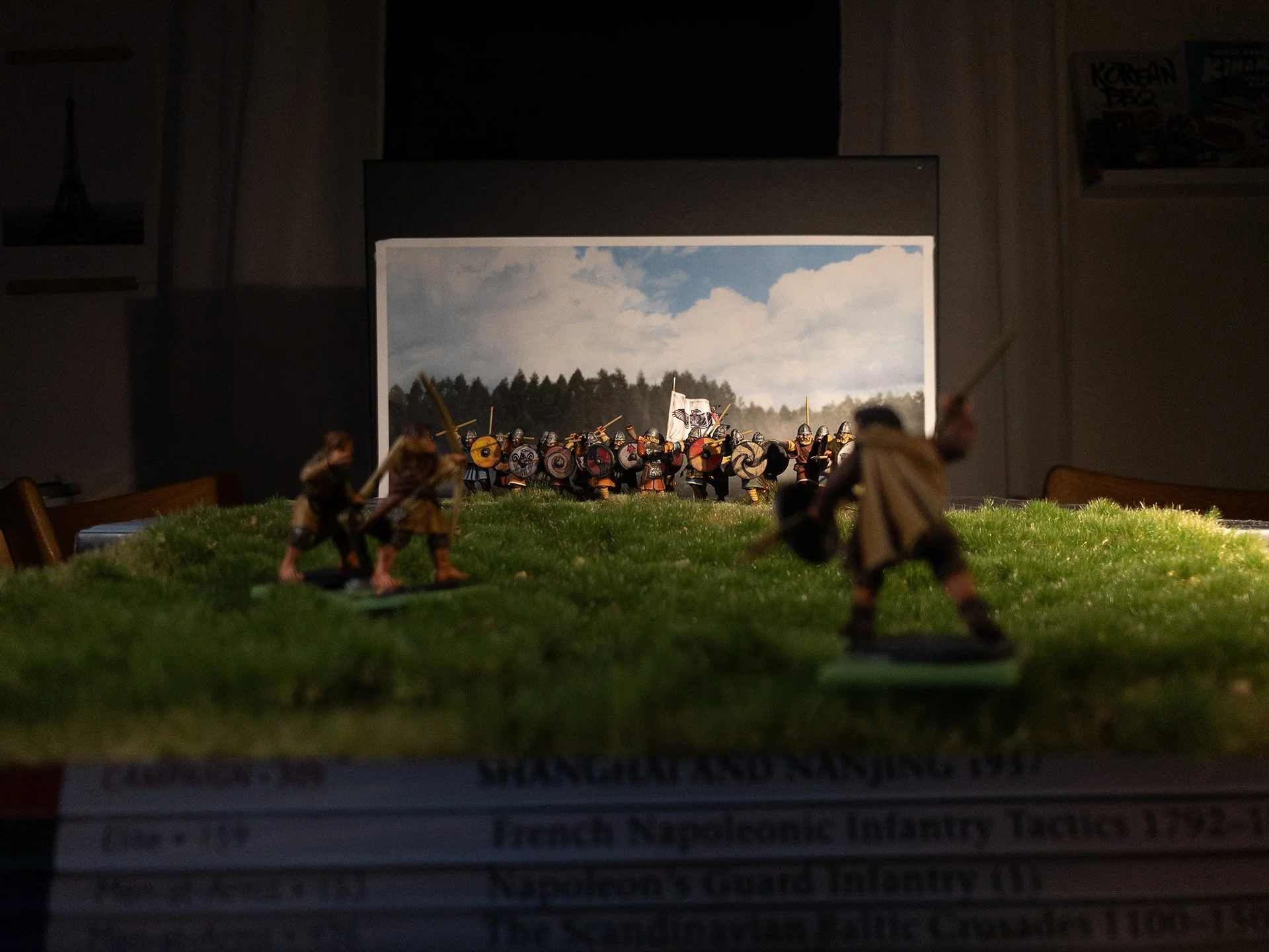 To keep it simple and straightforward here let's say we want to take a photo of a battle line of fierce viking warriors on the battlefield. So to start I pop down my chosen miniatures in the middleground as these are our subject and we want these to be the focus of the photo. As you can see I have placed both miniatures and smartphone on some books, this is because we need some difference in height. The miniatures should be level with the camera lens which is impossible to achieve if both the miniatures and the camera would be placed directly on the table.